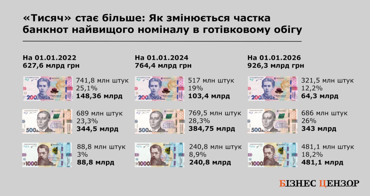 Водночас статистика НБУ свідчить, що за роки повномасштабної війни банкнота номіналом 1000 гривень відіграє все більшу роль. Якщо на початок 2022 року 55% суми готівкових коштів припадало на банкноти 500 гривень і лише 14% – на "тисячні" банкноти, то станом на початок 2026 року більше половини всіх грошей в обігу – це саме "тисячі". При цьому кількість банкот номіналом 1000 гривень лише за останні два роки збільшилася удвічі.