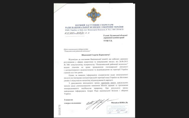 Одним из таких предприятий является Попаснянский водоканал, 90 % добываемой воды поставляющий на НКТ. Известно, что СНБО расценивает это как поддержку терроризма, тем более, на протяжении 3 лет вода поставлялась вообще безоплатно. Но ничего не меняется - правительство продолжает эти поставки и требует от ЛЭО обеспечивать этот водоканал электроэнергией, хотя водоканал уже должен ЛЭО более 150 млн грн.