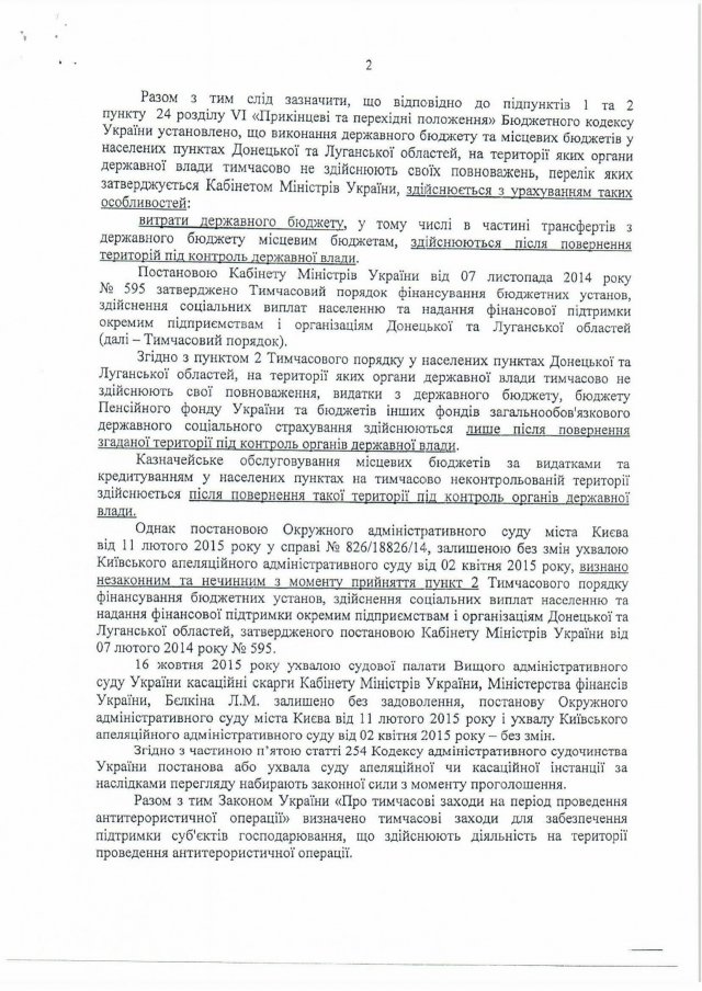 Известно, что обычно именно чиновники трепетно требуют исполнения законов, но в этом случае имеет место явное пренебрежение Конституцией и законодательной базой Украины. Так, «Временный порядок финансирования бюджетных учреждений, осуществления социальных выплат населению и предоставления финансовой поддержки отдельным предприятиям и организациям Донецкой и Луганской областей», утвержденный постановлением правительства №595 от 07.11.2014 года, а именно - его пункт 2 - признан судебной властью незаконным и недействительным с момента принятия. А именно на этот документ и его 2-й пункт зачастую и ссылаются чиновники, требуя перерегистрации ЛЭО.