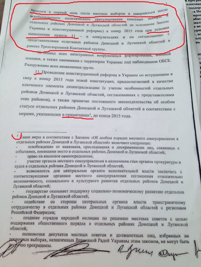 Постепенно до народа начало доходить, что в Минских соглашениях написано наоборот. СНАЧАЛА выборы, амнистия, финансирование от Украины, русский язык, трансграничное сотрудничество с РФ, народная милиция, очевидно переделанная из " бригад ДНР", а уж потом контроль над границей. Может быть. Если Путин решит, что он все таки сторона конфликта, а не мимо пробегал. Это пункты 9-11 "комплекса мер".
