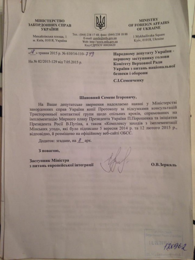 Кстати, давайте перестанем упоминать словосочетание "Минские протоколы". Официально они называются "Мирный план Президента Украины Петра Порошенко и инициативы Президента РФ Владимира Путина". Письмо от МИД прилагаю.