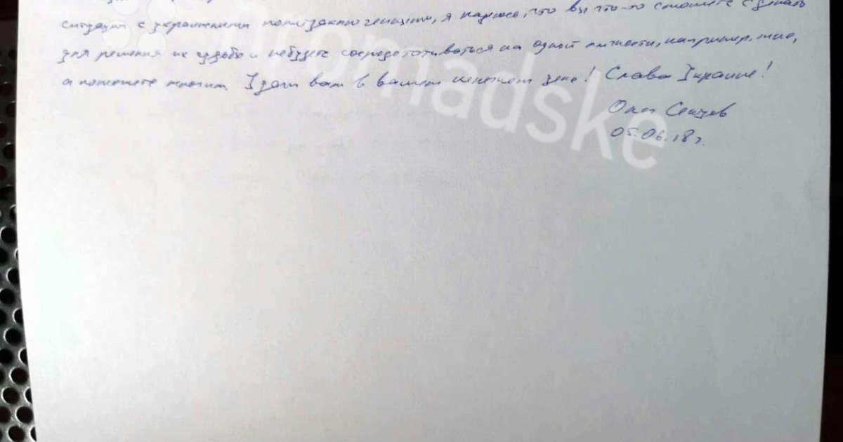 As reported by Censor.NET, a picture of the letter was passed to Hromadske by Sentsov’s sister Natalia Kaplan.