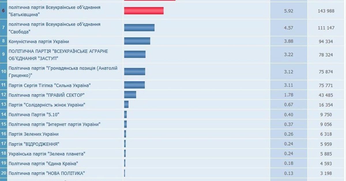 According to the information published on the interactive board in the press center of the CEC, the preliminary results of the elections to the Verkhovna Rada of Ukraine are: Samopomich - 10.81%, Opposition Bloc - 9.6%, the Radical Party - 7.52%, Batkivschyna - 5.81% votes. Other parties and blocs have not surpassed the 5% minimum according to the current results.