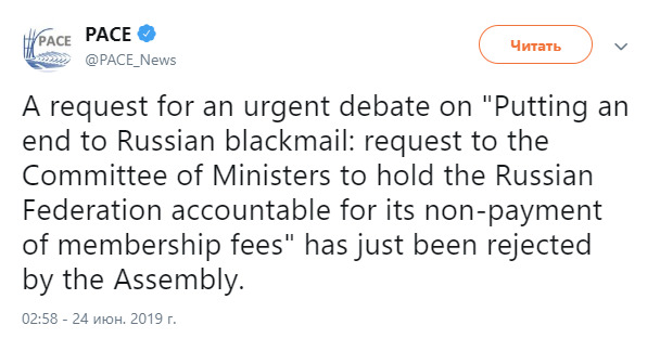 A request for an urgent debate on "Putting an end to Russian blackmail: request to the Committee of Ministers to hold the Russian Federation accountable for its non-payment of membership fees" has just been rejected by the Assembly," the PACE said on Twitter.