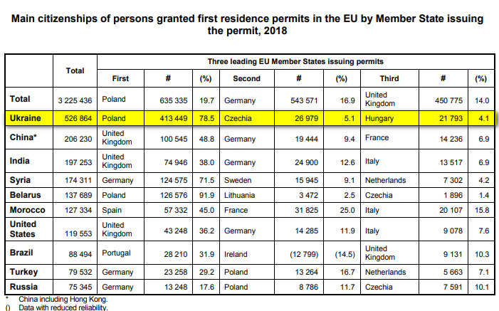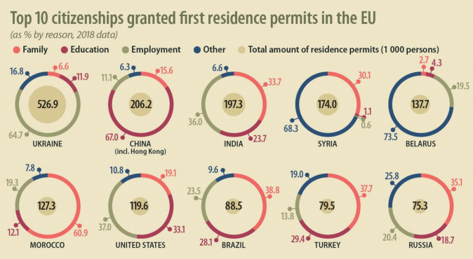 "In 2018, citizens of Ukraine (527 000 beneficiaries, of which almost 78% in Poland) continued to receive the highest number of permits in the EU, ahead of citizens of China (206 000, of which almost half in the United Kingdom), India (197 000, of which 38% in the United Kingdom), Syria (174 000, of which 71% in Germany), Belarus (138 000, of which 92% in Poland), Morocco (127 000, of which 45% in Spain), the United States (120 000, of which 36% in the United Kingdom), Brazil (88 000, of which 32% in Portugal), Turkey (80 000, of which 29% in Germany) and Russia (75 000, of which 18% in Germany)," reads the Eurostat report.