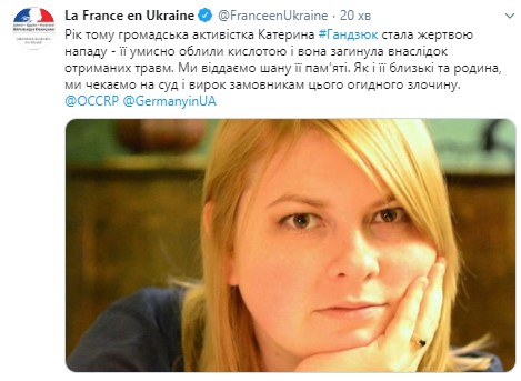 "Victim of an acid attack, activist Kateryna Handziuk succumbed to her injuries a year ago. We pay tribute to her memory. Like her family and relatives, we are waiting for the instigators of this heinous crime to be tried and sentenced," the Embassy of France in Ukraine said.