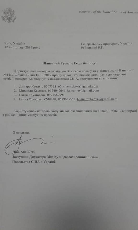 "Everything is fine in this letter. And the fact that the US embassy selects GPU prosecutors for us. And the fact that some underling do not even in the status of the ambassador says whom to include in the personnel commission," the deputy director commented on the letter The Department of Law Enforcement of the US Embassy in Ukraine Dina Aba-Ogli, in which she asks Ruslan Riaboshapka to complete the list of candidates for the personnel commission.