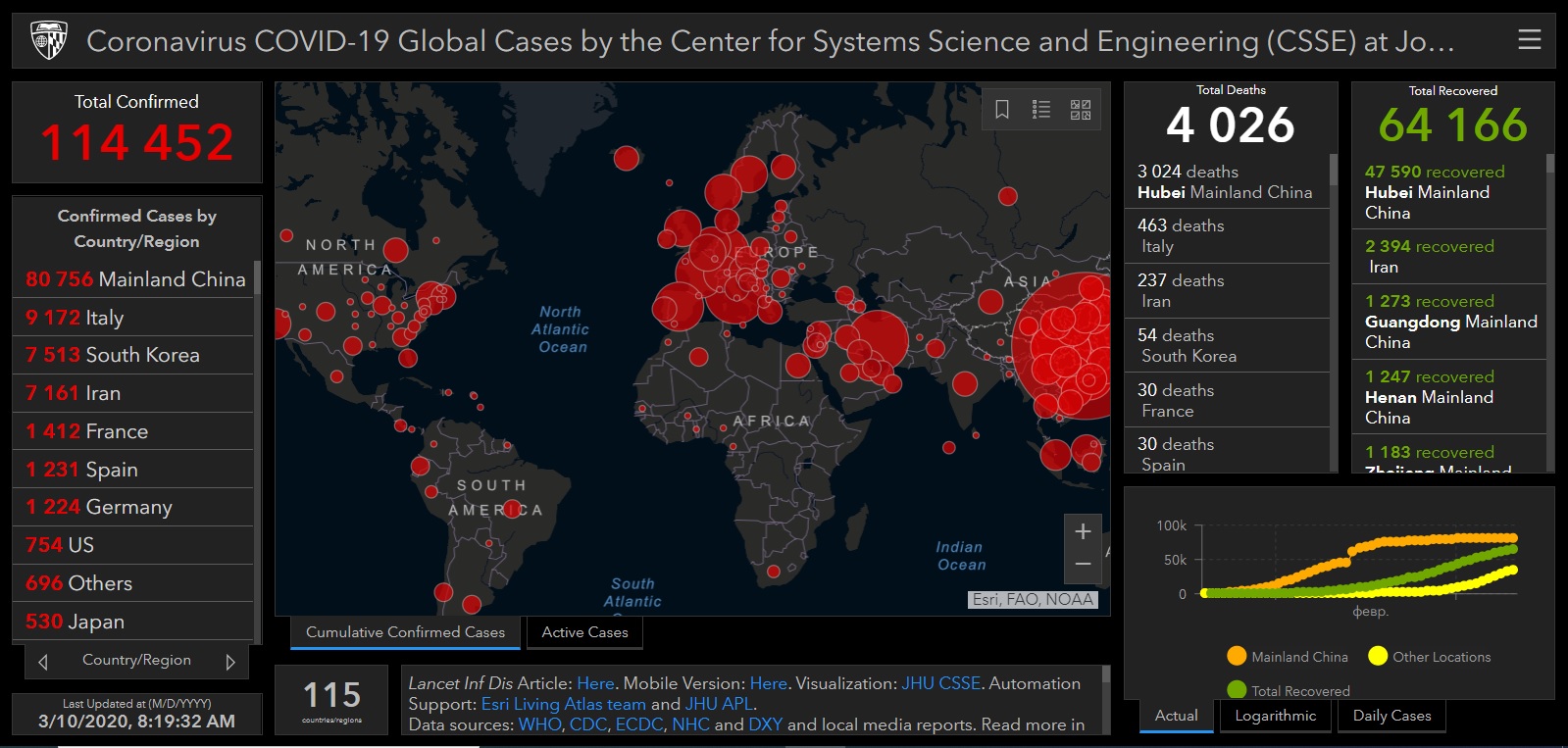 Since the start of coronavirus covid-19 outbreak, 114,448 people have been infected and 64,156 – cured, that's according to the Center for Systems Science and Engineering (CSSE) at Johns Hopkins University (JHU).