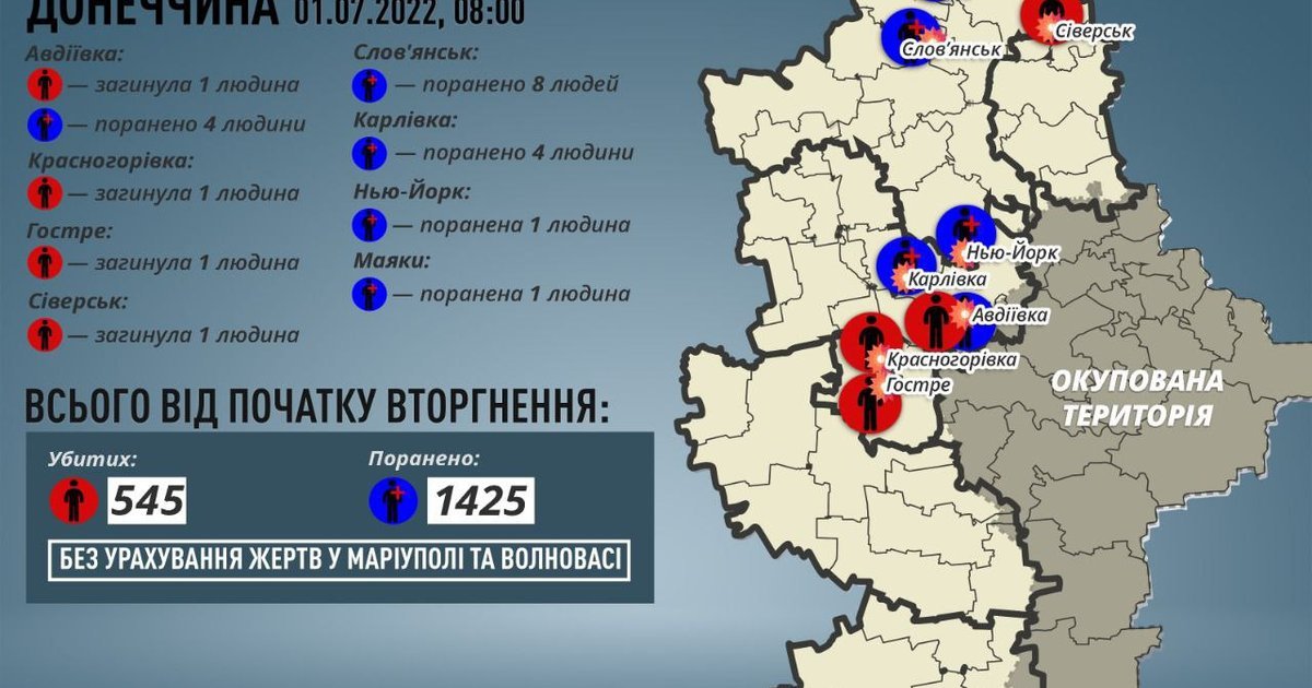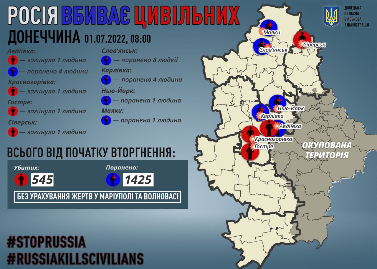 According to the published infographic, in total, since the beginning of the full-scale invasion, the Russian invaders have killed 545 and wounded 1,425 civilians in Donetsk region.