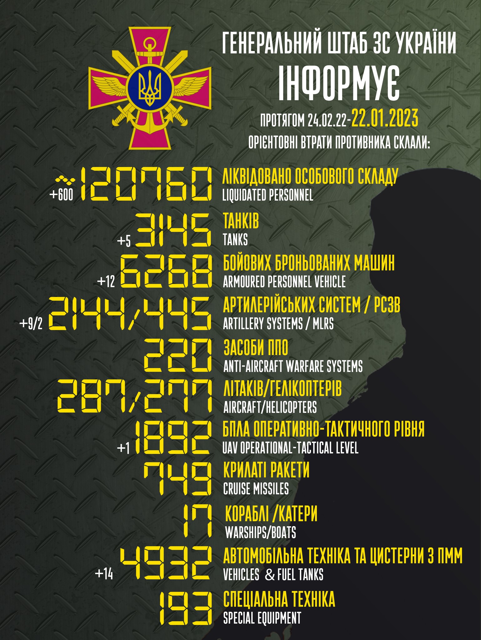 The losses of the Russian occupiers as of the morning of January 22, 2023, are approximately 120,760 people.