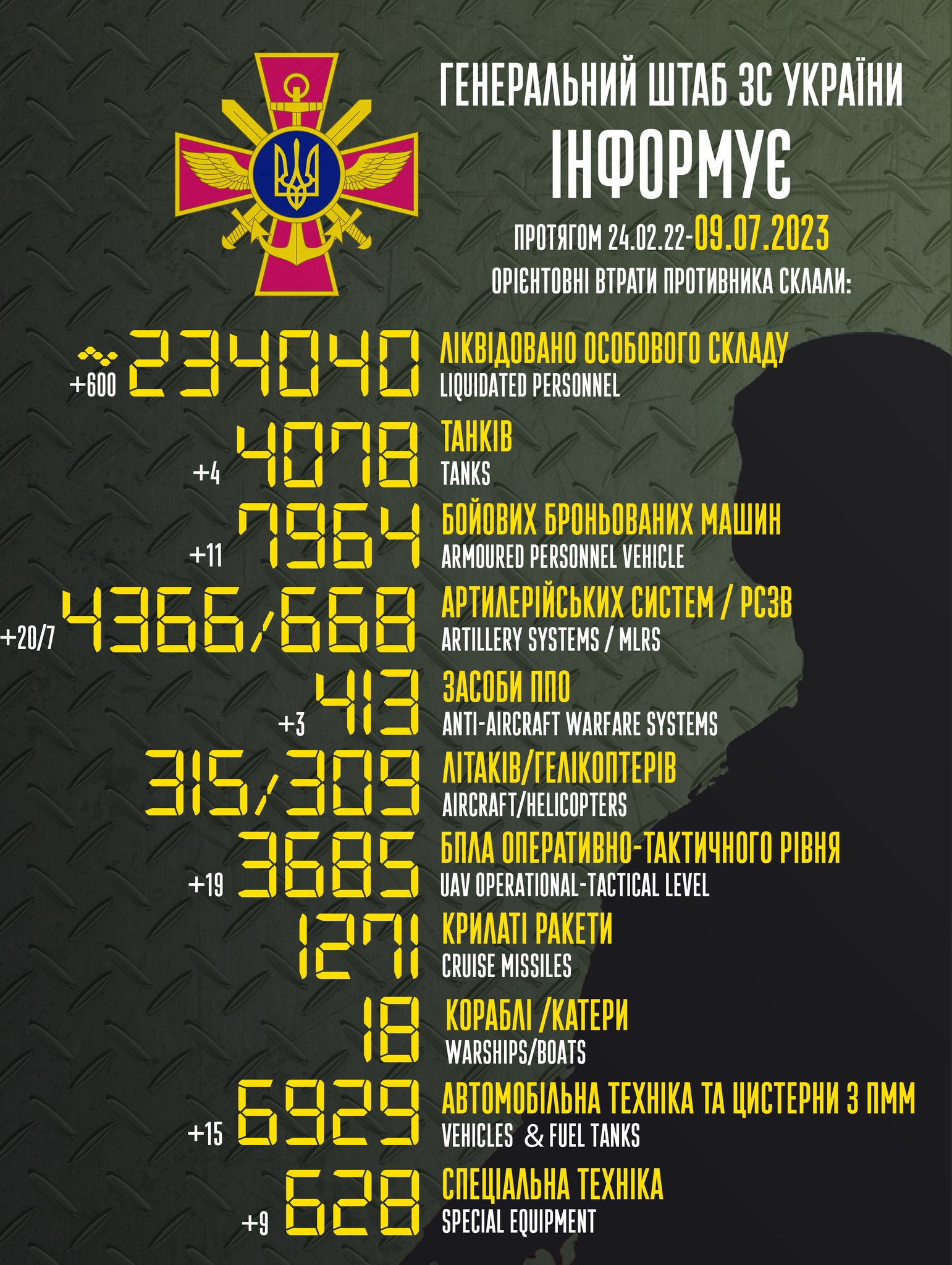 As of the morning of 9 July 2023, the losses of the Russian occupiers are approximately 234,040 people.