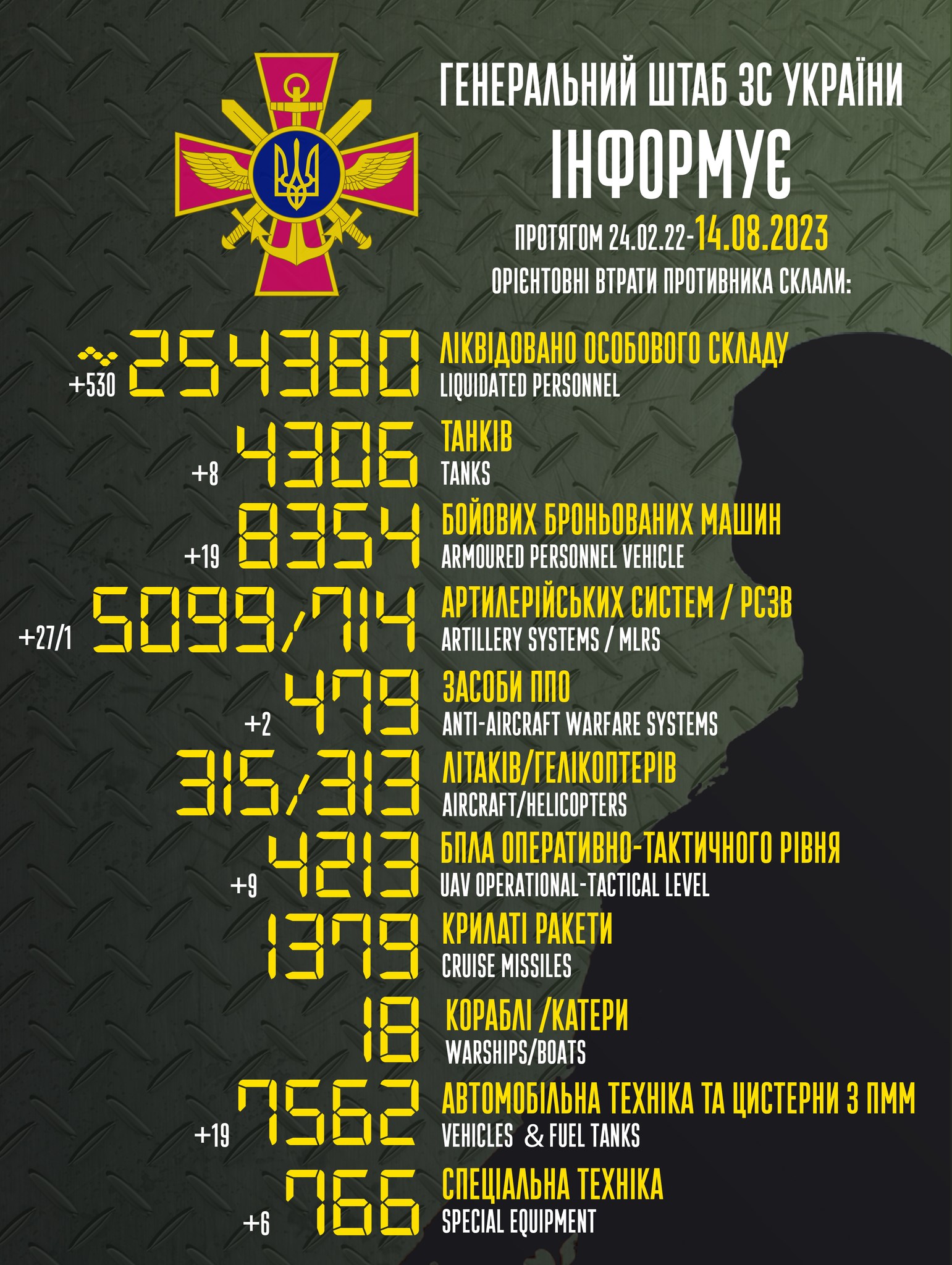 As noted, the total combat losses of the enemy from 24.02.22 to 14.08.23 are approximately: