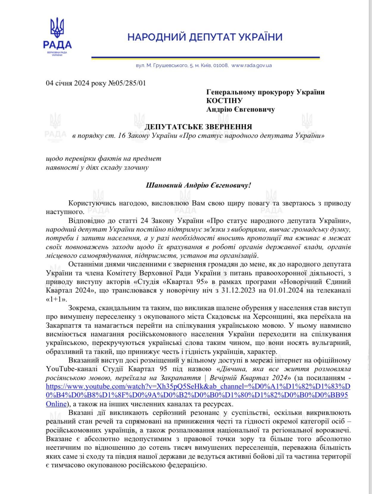 "As promised, today I sent a request to the Prosecutor General's Office regarding the verification of the actions of the actors and authors of the Studio "Kvartal 95" during the performance entitled "The girl who spoke Russian all her life, moved to Transcarpathia | Vechirnii Kvartal 2024" for the presence in these actions, the crime under Art. 161 of the Criminal Code of Ukraine," she wrote.