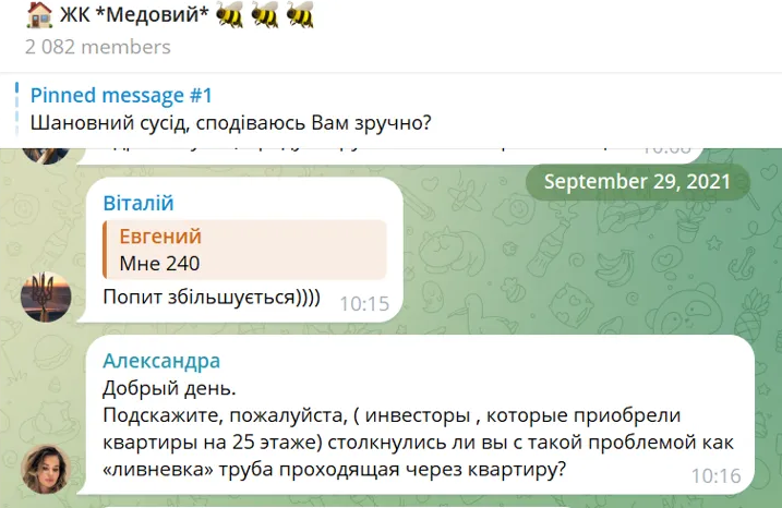 In another house chat of the Medovyi residential complex, tellingly titled "Owners", Oleksandra Trofimenko writes about the debt for housing and communal services and directly states that she paid the cost of the apartment without taking out loans.