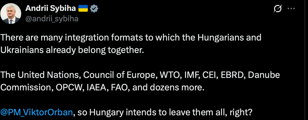 "There are many integration formats to which Hungarians and Ukrainians already belong together. The UN, the Council of Europe, the WTO, the IMF, the CEI, the EBRD, the Danube Commission, the OPCW, the IAEA, the FAO and dozens of others. So, Hungary intends to withdraw from all of them, right?" Sybiha asked rhetorically.