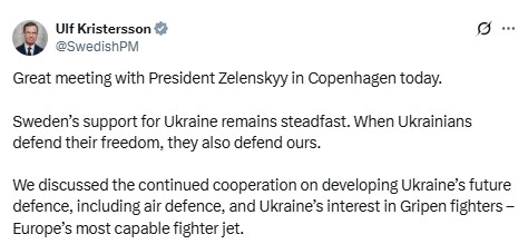 "Sweden’s support for Ukraine remains steadfast. When Ukrainians defend their freedom, they also defend ours. We discussed the continued cooperation on developing Ukraine’s future defence, including air defence, and Ukraine’s interest in Gripen fighters – Europe’s most capable fighter jet," Kristersson said.