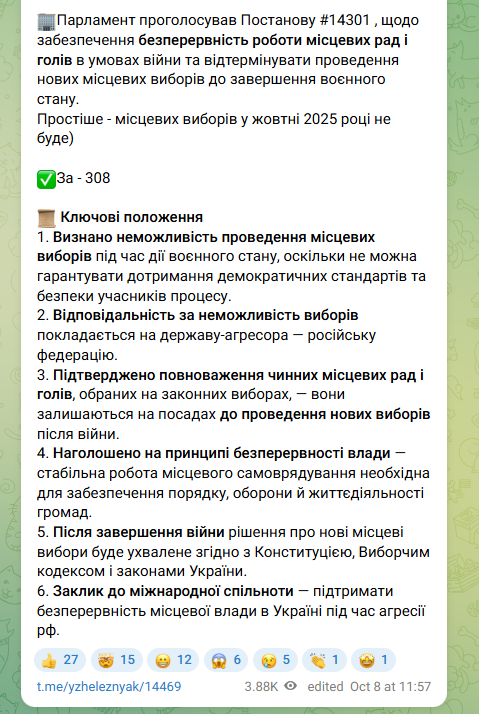 - After the end of the war, the decision on new local elections will be made in accordance with the Constitution, the Electoral Code and the laws of Ukraine.