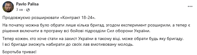 Now, anyone of this age who wants to defend Ukraine can choose any brigade. All brigades can now recruit motivated young people into their ranks. The fight goes on!" he said.