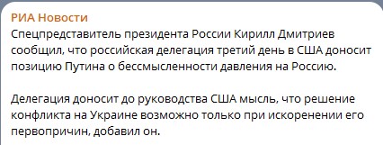 "Special Representative of the President of Russia Kirill Dmitriev said that the Russian delegation has been in the US for three days conveying Putin's position on the futility of pressure on Russia," the statement said.