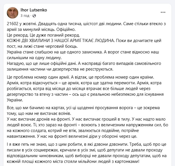 "We have enough drones on the front line. We have enough money in the rear. We have too few people fighting. Those who are now on the front line are fighting with enormous strain, because every soldier who has not fled has to bear double or triple the load. Because of this, we have huge gaps in our defences on the front line," Lutsenko writes.