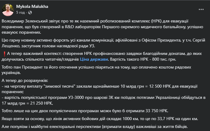 President Volodymyr Zelenskyy said ground robotic systems (GRS) designed for casualty evacuation, developed in the R&D labs of the First Separate Medical Battalion, has been successfully evacuating the wounded. The system was funded through charitable donations. The price of one such GRS is 800,000 hryvnias. In the author’s view, the President and his entourage are touting something paid for by ordinary Ukrainians.