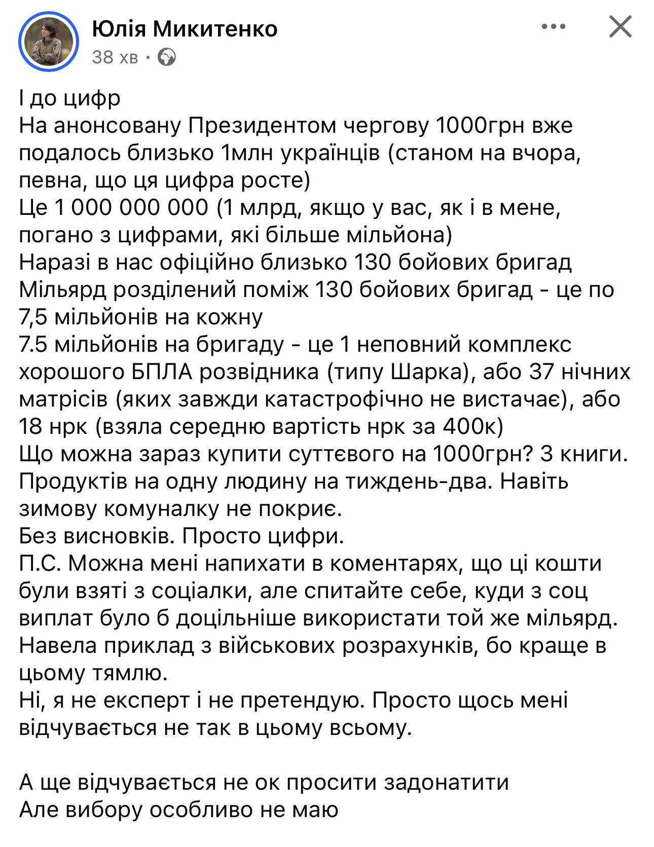 "And now for the figures. About 1 million Ukrainians have already applied for the additional 1,000 hryvnias announced by the president (as of yesterday, I am sure that this figure is growing). That is 1,000,000,000 (1 billion, if, like me, you are not good with numbers larger than a million). We currently have about 130 combat brigades. A billion divided among 130 combat brigades is 7.5 million for each. 7.5 million per brigade is one incomplete set of a good reconnaissance UAV (such as Shark), or 37 night vision goggles (which are always in dire shortage), or 18 NRK (taking the average cost of NRK at 400k). What can you buy for 1,000 hryvnia these days? Three books. Food for one person for a week or two. It won't even cover winter utilities. No conclusions. Just numbers," wrote the soldier.
