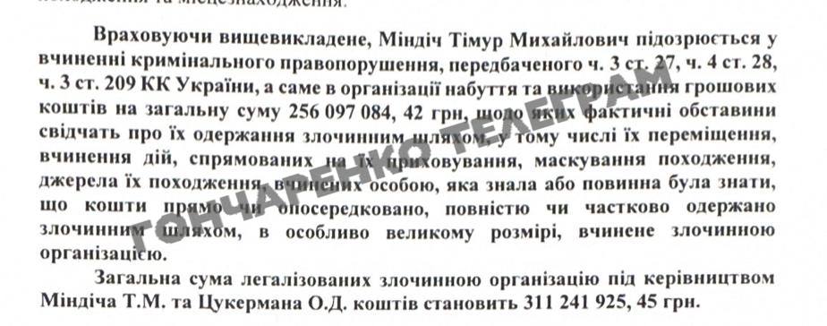 The case files state that Tymur Mindich unlawfully obtained more than UAH 256 million.