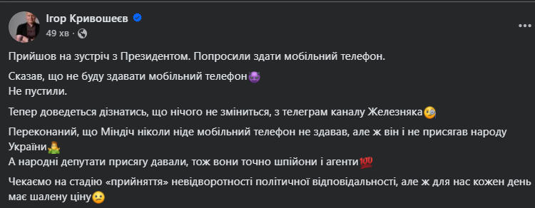 "I came to the meeting with the President. They asked me to hand over my mobile phone. I said I wouldn’t. They didn’t let me in," Kryvosheiev wrote.