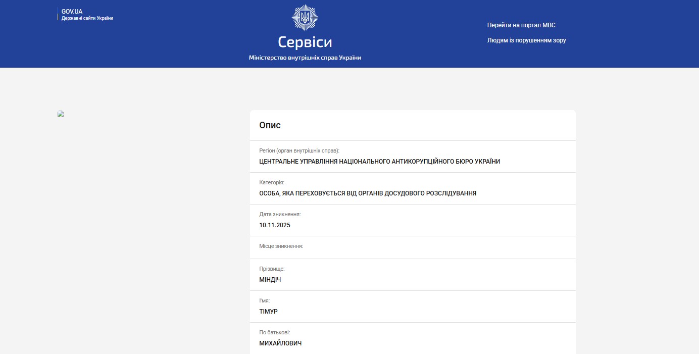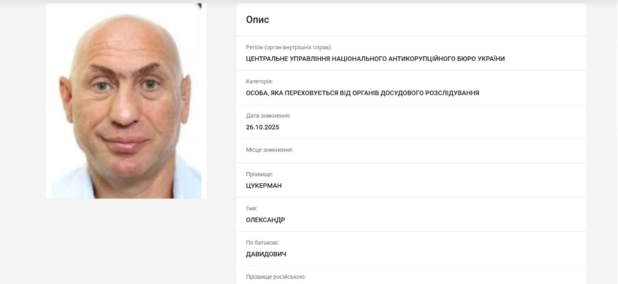 The suspects' profiles are listed in the section "Persons hiding from pre-trial investigation authorities." Mindich's date of disappearance is listed as 10 November 2025, and Tsukerman's as 26 October 2025.