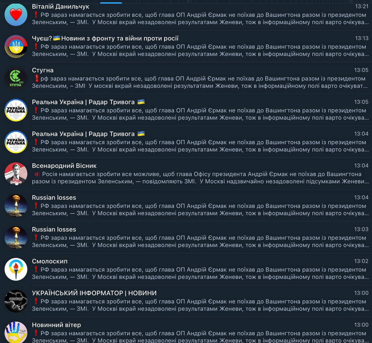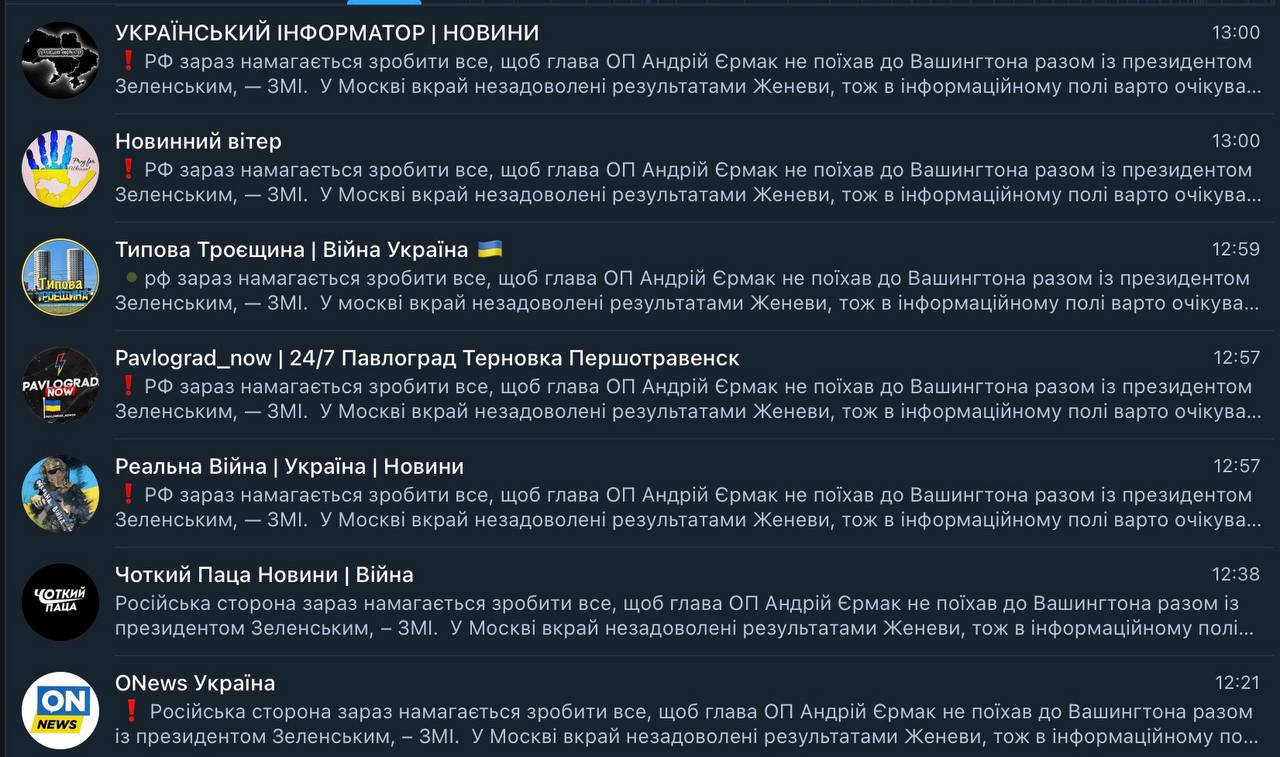 We quickly analyzed how this works: 1) At 11:29, this message is published on Yermak's Telegram channel "Card Office." 2) An hour later, it starts circulating on other Telegram channels.