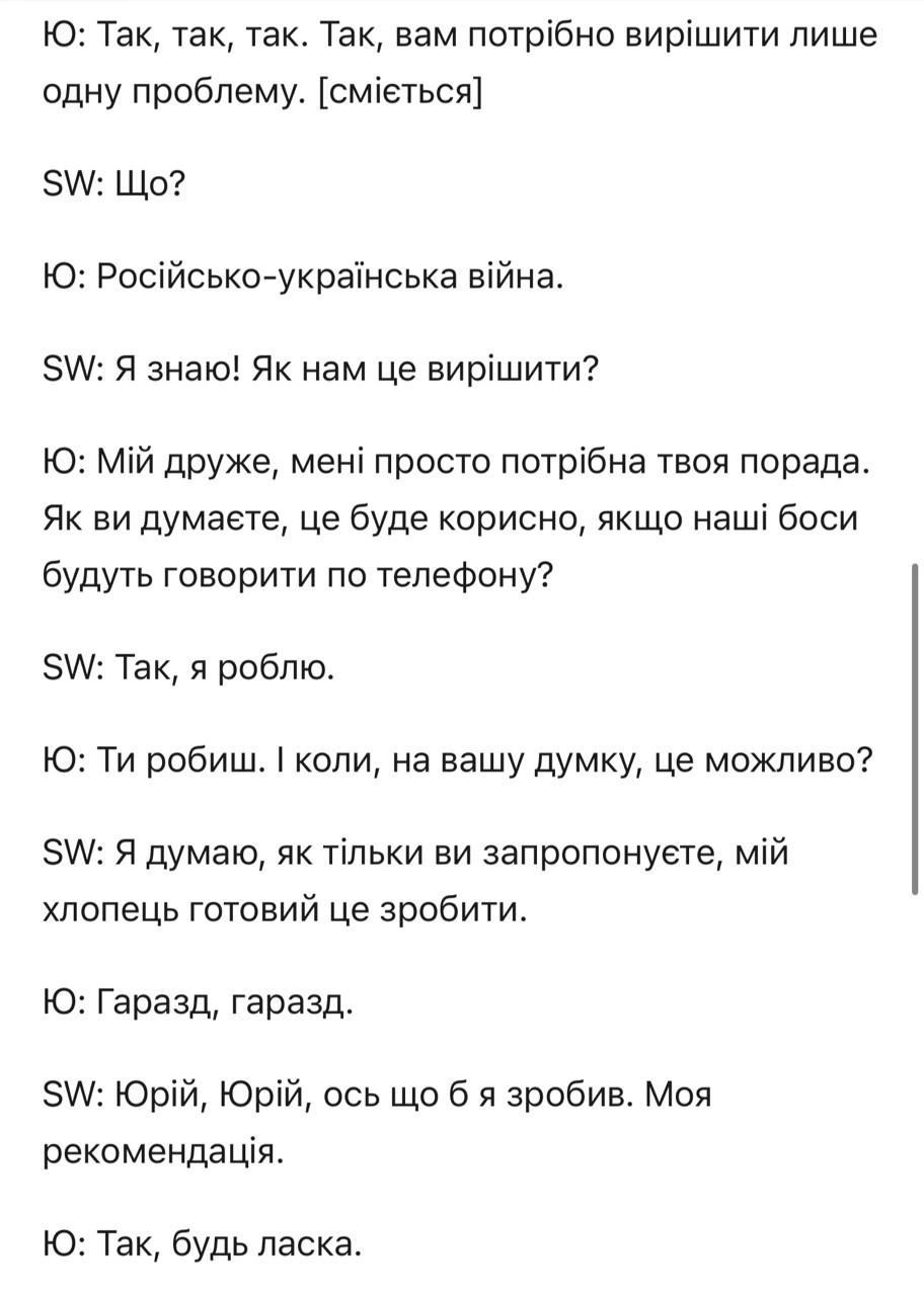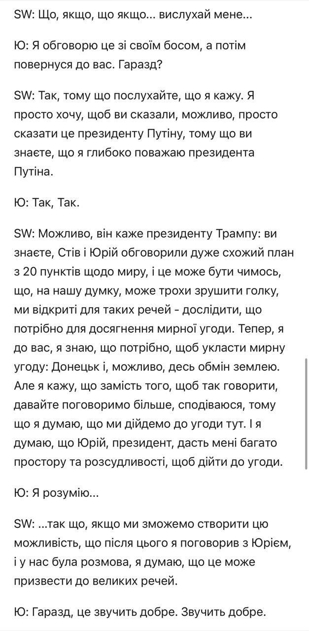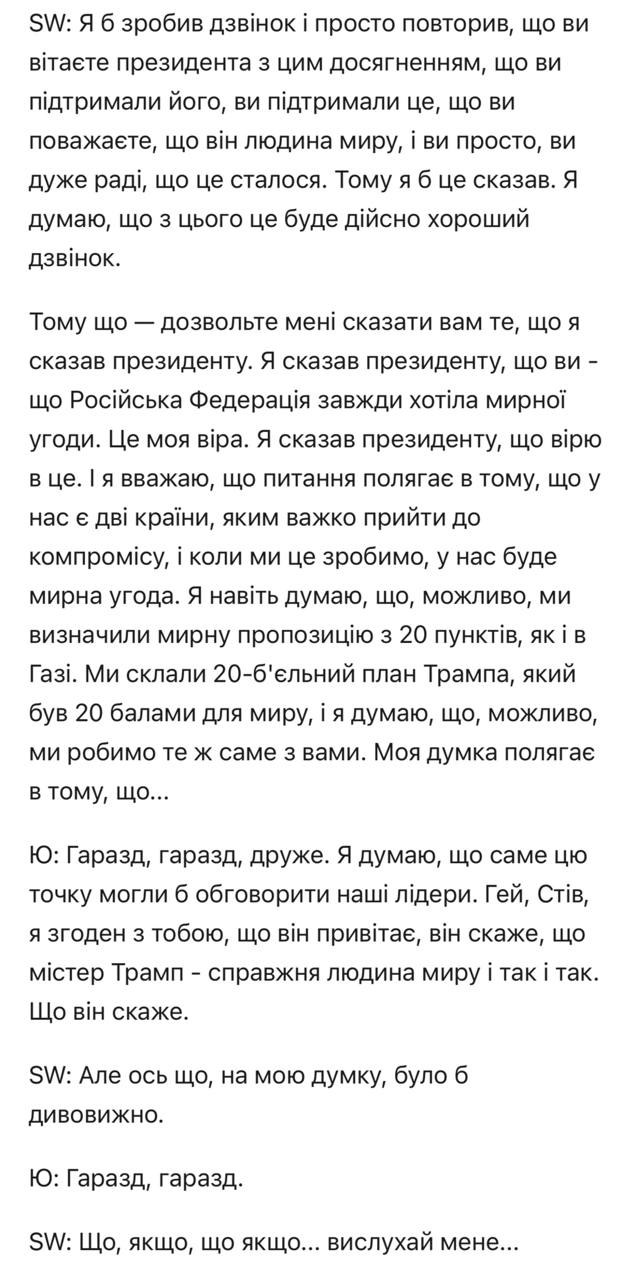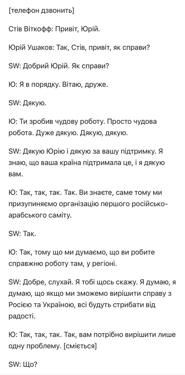 Bloomberg has published the text of a telephone conversation between US Special Representative Steve Witkoff and Vladimir Putin's adviser Yury Ushakov, in which they discussed the preparation of the American peace plan, Censor.NET reports.