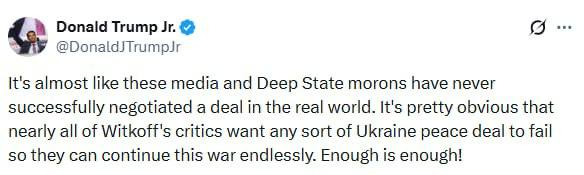 "It seems that these media outlets and idiots from the 'deep state' have never succeeded in negotiations in the real world. It is quite obvious that almost all of Witkoff's critics want any peace agreement in Ukraine to fail so that they can continue this war indefinitely. Enough is enough!" he wrote.