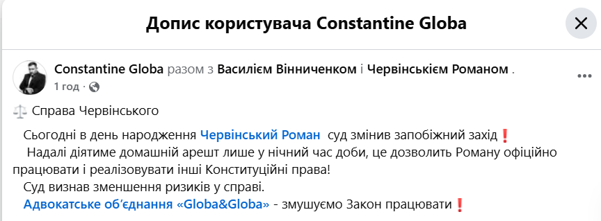 Today, on Roman Chervinskyi's birthday, the court changed his preventive measure. From now on, he will only be under house arrest at night, which will allow Roman to officially work and exercise his other constitutional rights!
