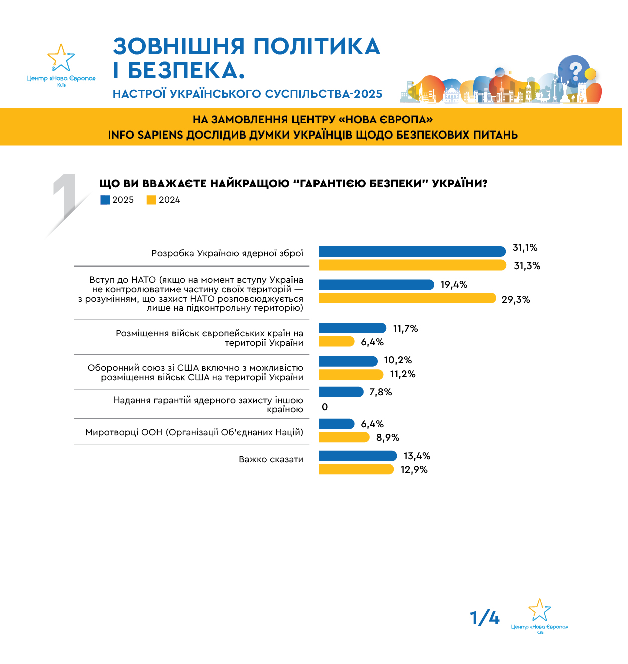 31.1% of Ukrainians believe that the most effective guarantee of security for Ukraine is the creation of its own nuclear weapons.