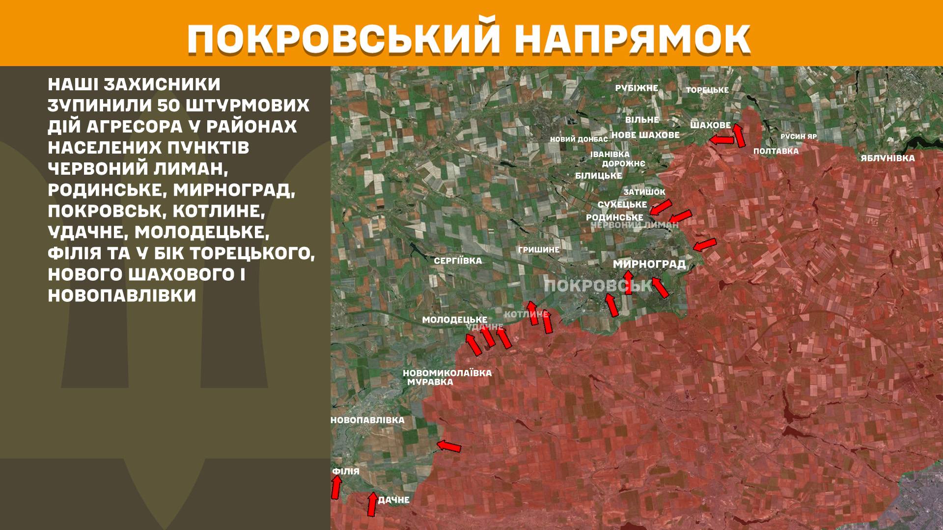 In the Pokrovsk direction, our defenders stopped 50 assaults by the aggressor in the areas of the settlements of Chervonyi Lyman, Rodynske, Myrnohrad, Pokrovsk, Kotlyne, Udachne, Molodetske, Filiia, and in the direction of Toretsk, Nove Shakhove, and Novopavlivka.