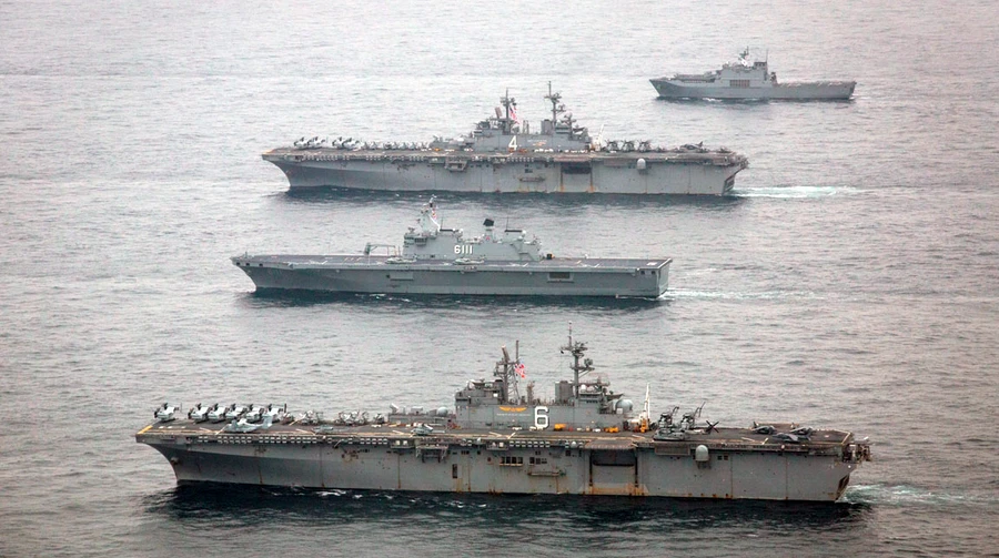 The ships are equipped with F-35 Lightning II fighter jets, missile systems, and equipment for amphibious operations.
