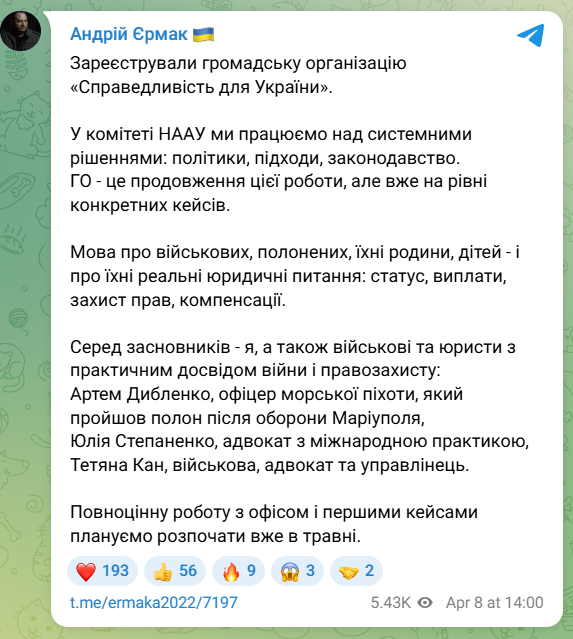 Yermak registers Justice for Ukraine NGO to help military personnel and POWs