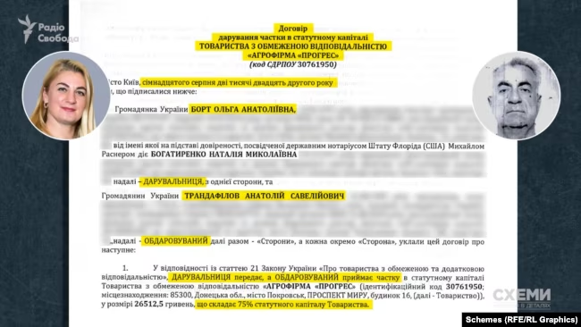 Following the start of the full-scale Russian invasion in August 2022, Olha Bort gifted a 75% stake in "Agrofirma Progres" – the co-founding company of "Agrofirma Nyva" – to her father, Anatoliy Trandafilov. Schemes has obtained the corresponding deed of gift.