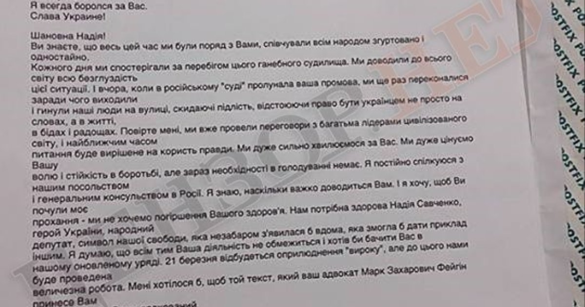 He wrote later: "Nadiia was delivered a fake letter from the president of Ukraine to discredit her in connection with the end of a dry hunger strike." Feigin accused the Kremlin of this provocation.