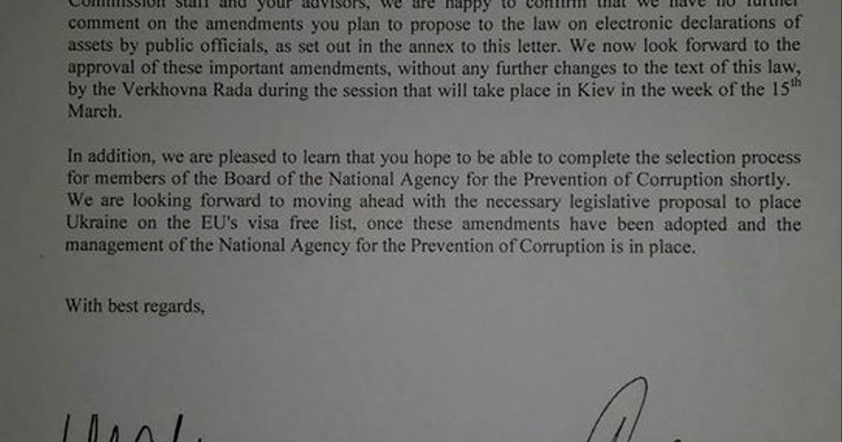 Later, president's press secretary Sviatoslav Tseholko wrote on Facebook: "The Ukrainians have every chance to travel without visas to the Schengen countries already this year. The president of Ukraine and the public activists managed to agree with the European Commission on the amendments to legal acts regarding the peculiarities of submitting asset declarations by public officials already in 2016.