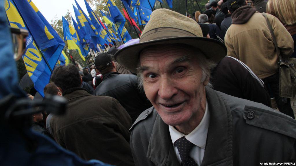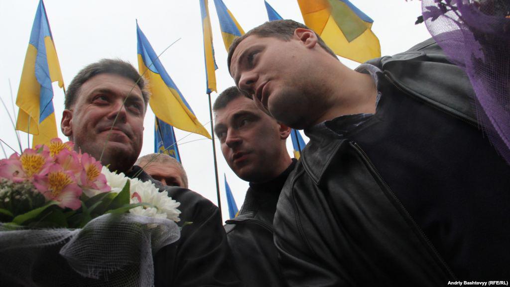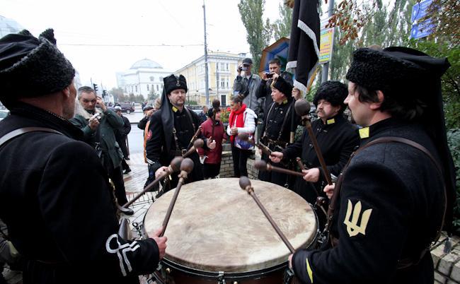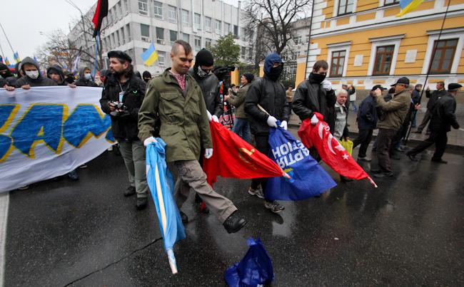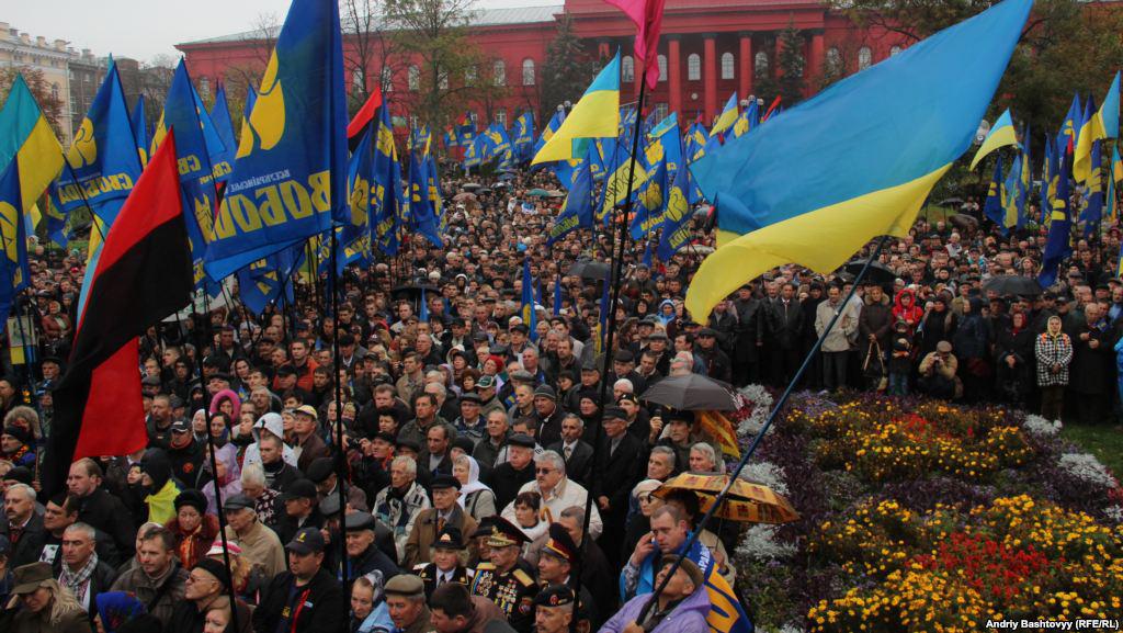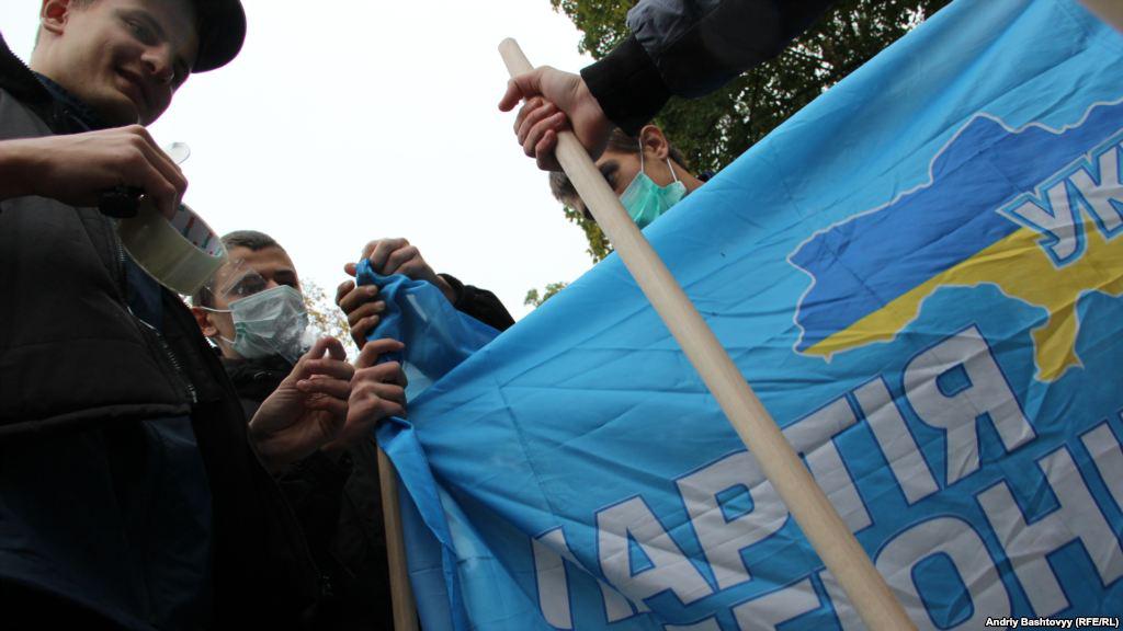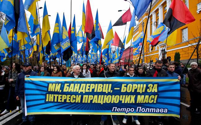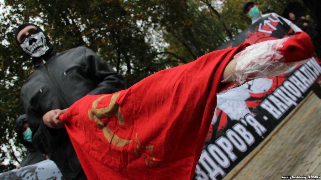 Two events took place in Kyiv on Sunday, October 15 - the Communists 'hanged' Bandera and Shuhevych (nationalist heroes of the beginning of the 20th century) and Svoboda (nationalists) activists stomped and burned the flags with the Communists and the Party of Regions symbolic.
