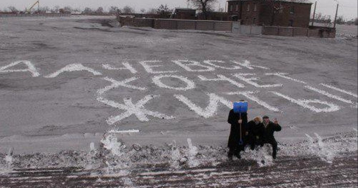 Inscription by Alchevsk residents in the snow near the local steel mill.