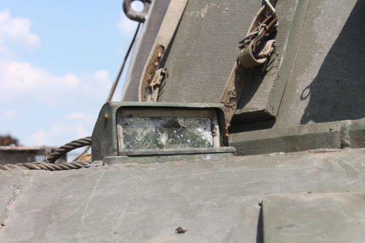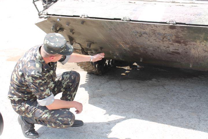 For example, Lieutenant Colonel Vitaly Bakhmat demonstrated the IFV with traces of numerous disruptions that was recently brought to the military base. Fighting vehicle was hit by two shots from an RPG in the side armor and gear compartment. It also has traces of machine gun and sniper shots.
