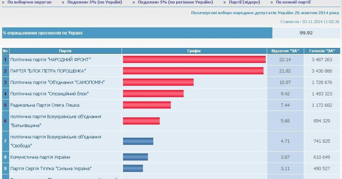 Thus, People's Front received 22.14% of votes (3,487,263 votes), Petro Poroshenko Bloc - 21.82% (3,436,886 votes), "Samopomich" - 21.82% (3,436,886 votes), "Opposition Bloc" - 9.42% (1,483,323 votes), "Liashko Radical Party" - 7.44% (1,172,682 votes), "Batkivshchyna" - 5.68% (894,329 votes).