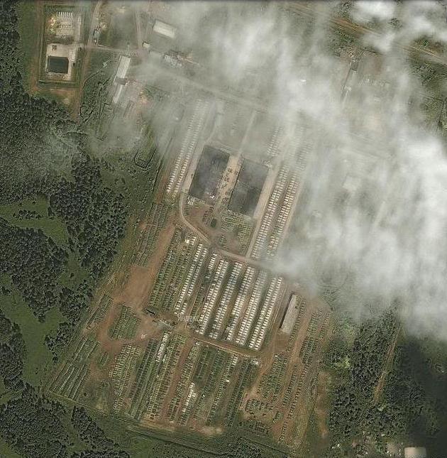 At the end of the world (Krasnoyarskiy Krai, Russian Federation), near the village with a funny name Kozulka, the 2544 Central base of tank reserve is situated (military unit 54630). They keep a huge variety of armored vehicles at this base. The scale can be estimated from a satellite photo: