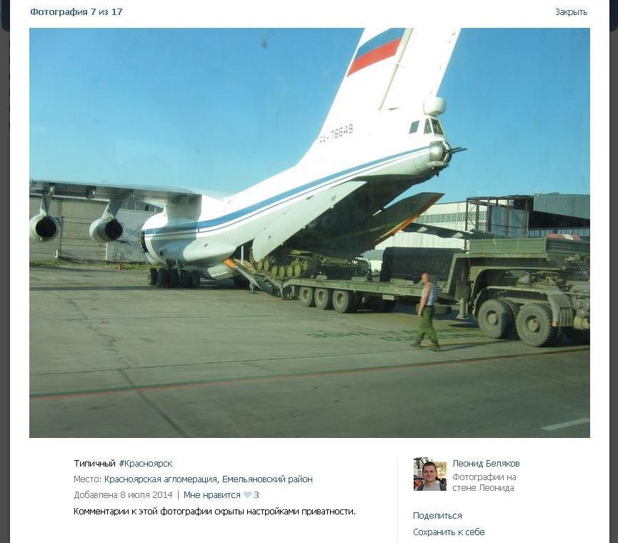 Shipping of tanks from Krasnoyarsk on May 31 was not the only one, as confirmed by the July photo taken by a user of social network VKontakte. On this photo, T-64BV is loaded into an IL-76: