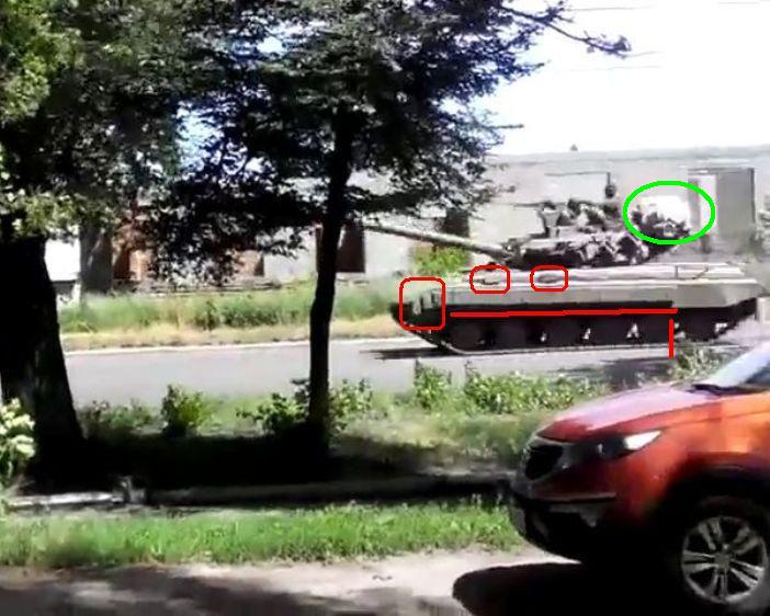 Quite predictably it turns out that T-64BVs on Russian trucks from M4 "Don" highway on June 19 and T-64BVs under the separatists' flags in Ukrainian cities in the Donbas on June 20 are the same. Two of them are with the standard dynamic protection on the sides, three of them have self-made protection, on turret tops there are some stores covered with tarpaulin: