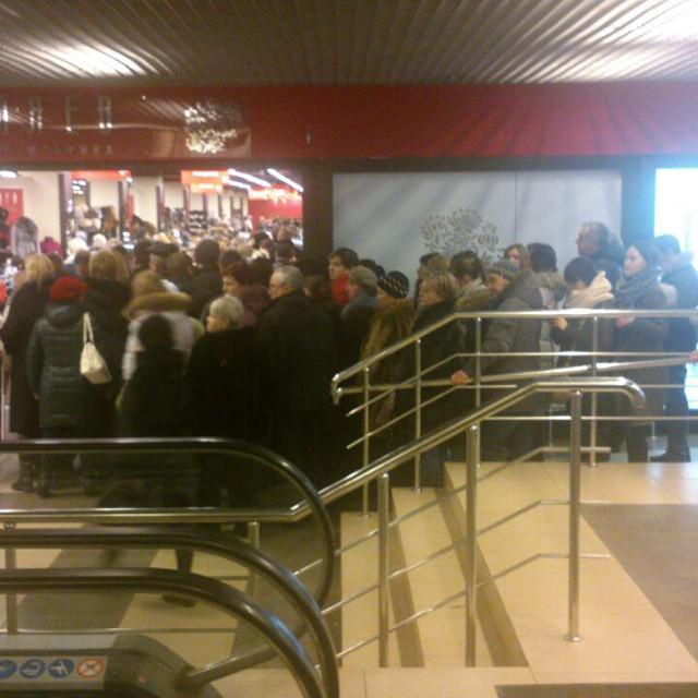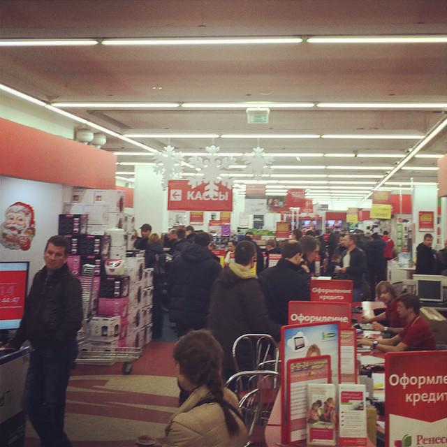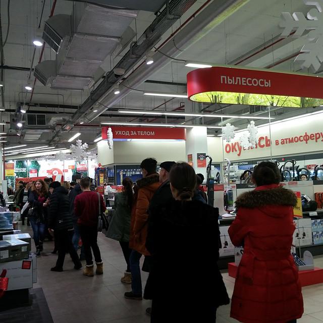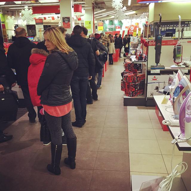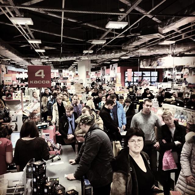 anastasiaserebryanskaya: "This is the line to the cashier, people grab whatever they see #mvideo #kalinigrad #euro100"