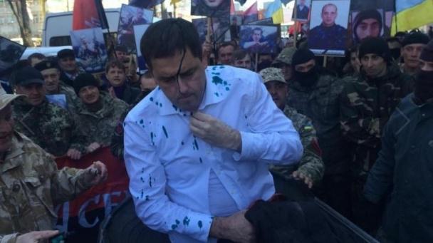 At the entrance to the train station, the men demanded Kavatsiuk to write a letter of resignation, and after he refused, they poured brilliant green over him. Then they threw eggs at him, demanding to resign for the second time. Kavatsiuk again refused.