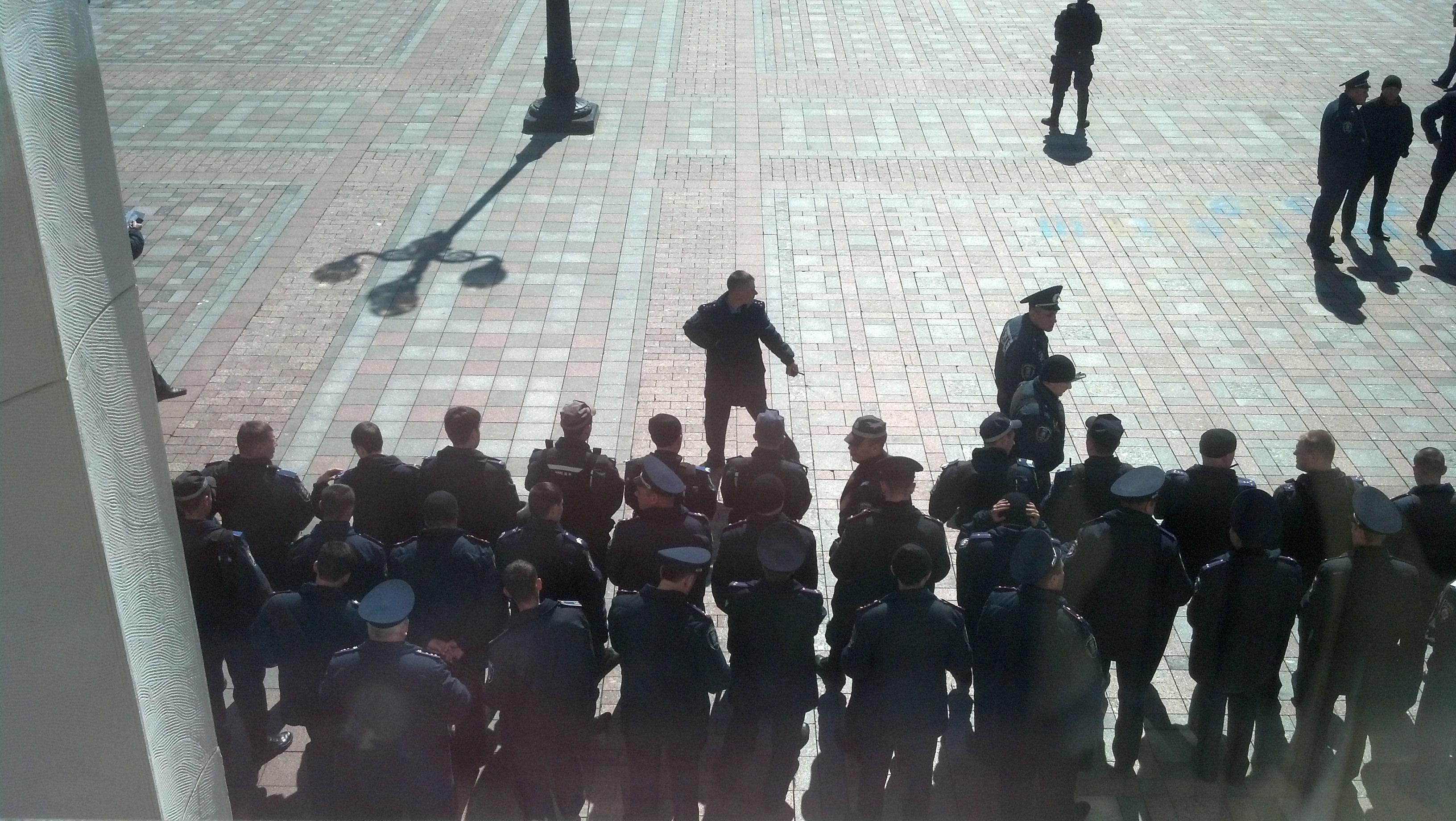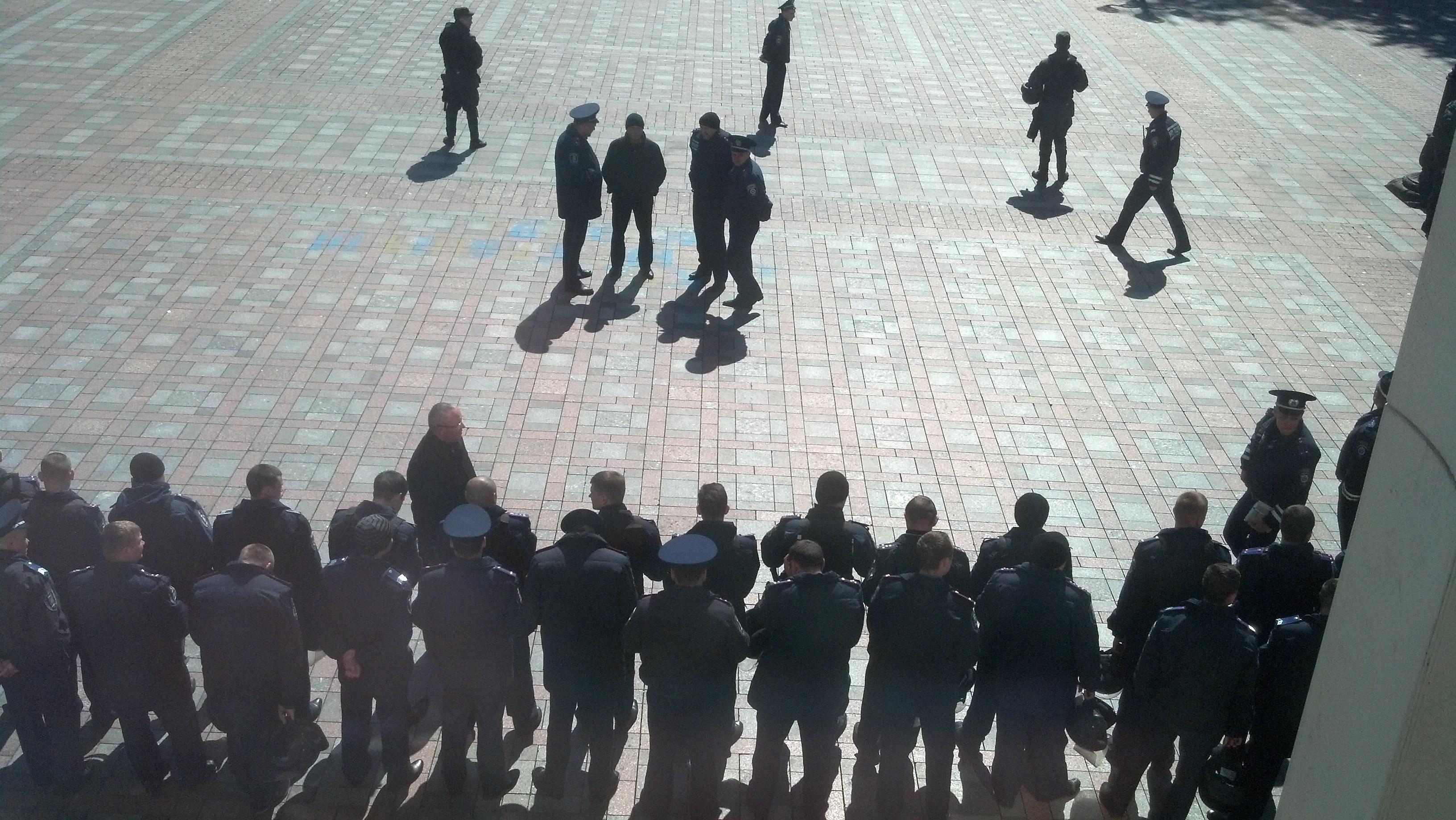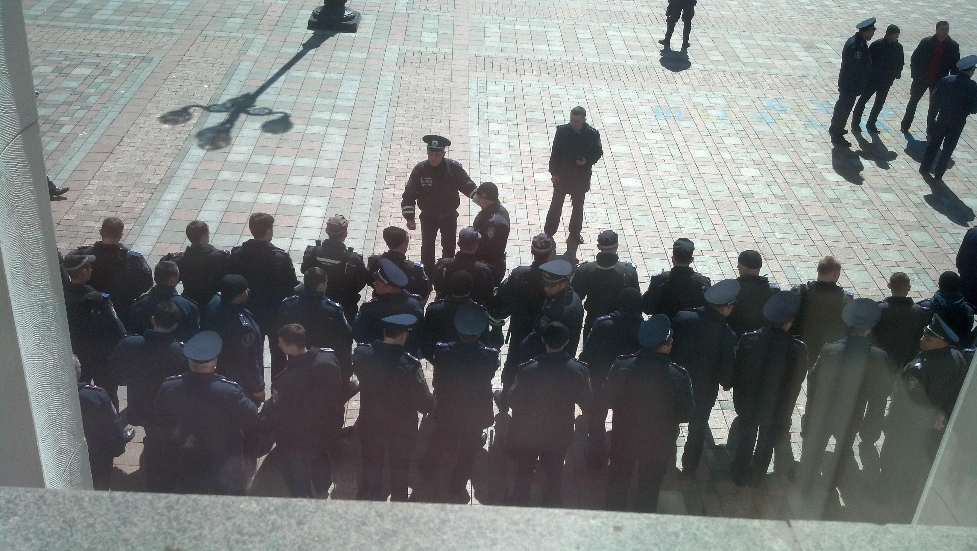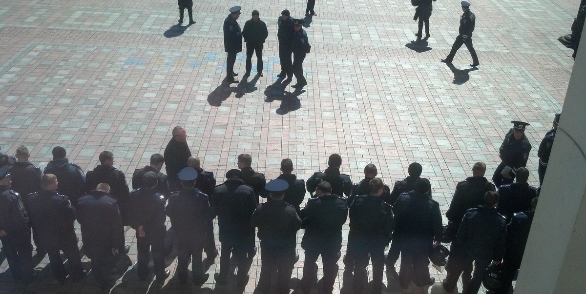 Law enforcers have tightened security at the building of the Verkhovna Rada of Ukraine. At the central entrance to the parliament, police officers are drawn up three deep.